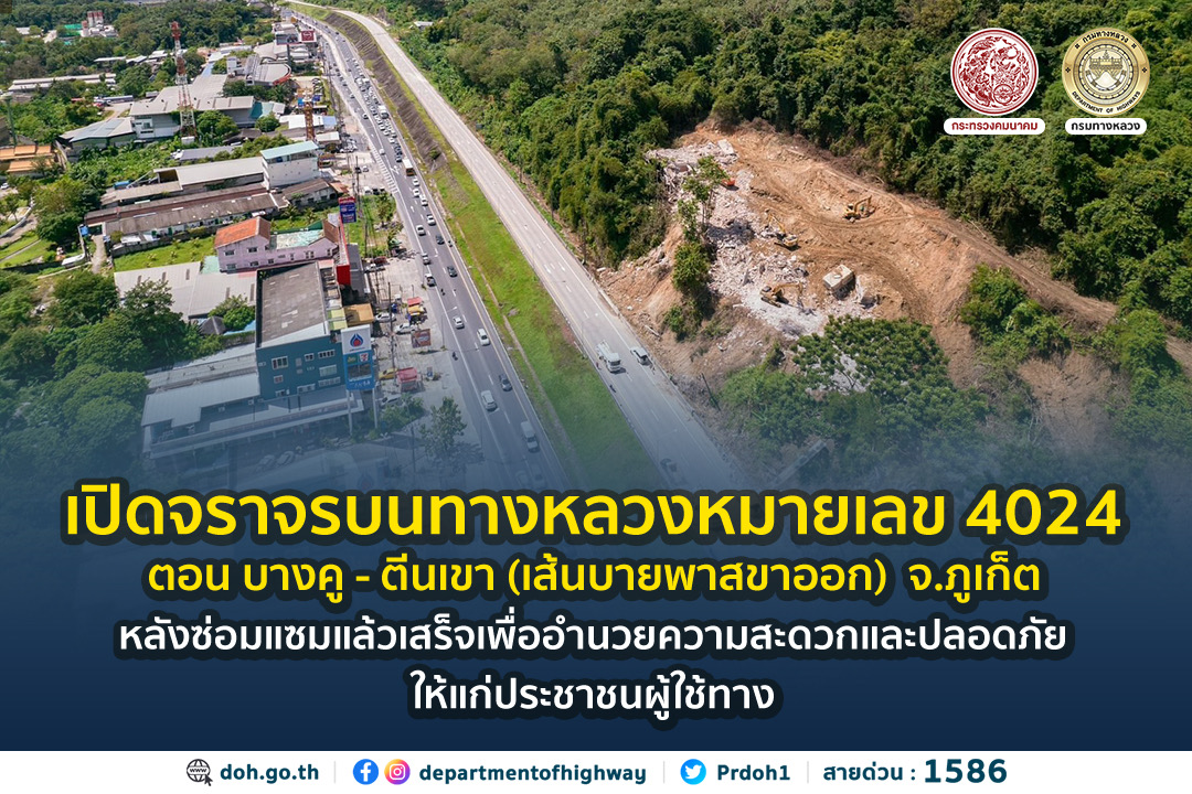 กรมทางหลวงเปิดจราจรบนทางหลวงหมายเลข 4024 ตอน บางคู - ตีนเขา (เส้นบายพาสขาออก) จ.ภูเก็ต หลังซ่อมแซมแล้วเสร็จเพื่ออำนวยความสะดวกและปลอดภัยให้กับประชาชนผู้ใช้ทาง