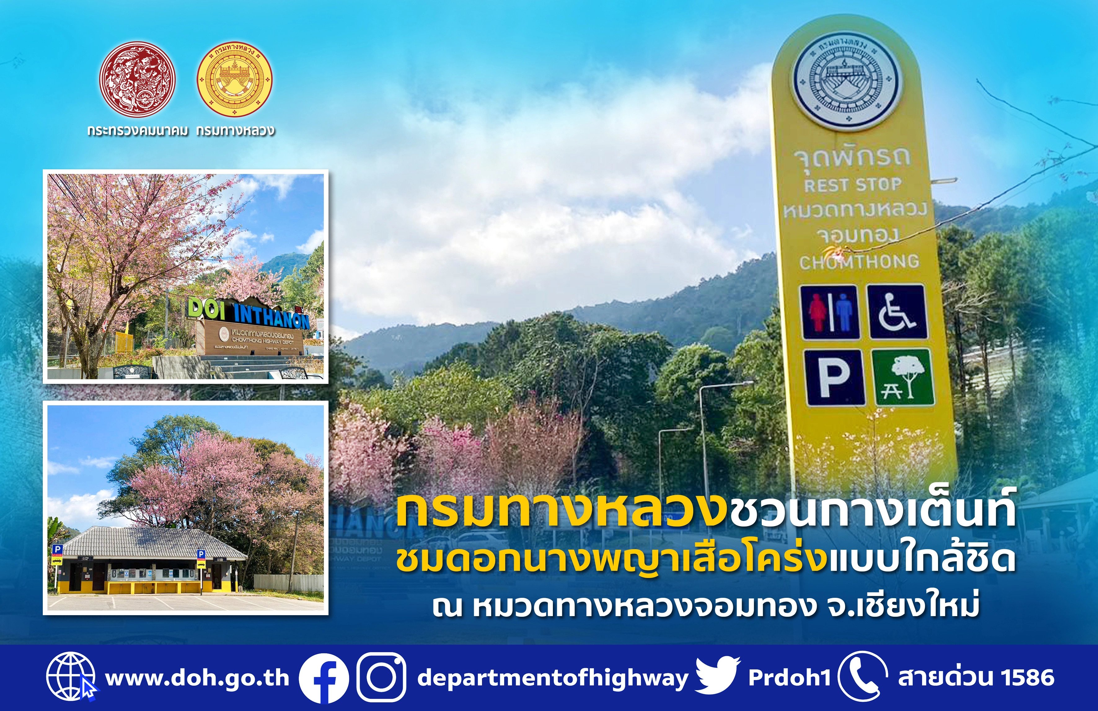 ทั้งนี้ กรมทางหลวงขอความร่วมมือประชาชนเดินทางอย่างปลอดภัยและใส่ใจสิ่งแวดล้อม โปรดใช้ความระมัดระวังในการใช้เส้นทาง ปฏิบัติตาม “ชีวิตวิถีใหม่ ขับขี่อย่างปลอดภัย ไร้อุบัติเหตุ” เพื่อความสะดวกปลอดภัยของผู้ร่วมทาง หากประชาชนต้องการจองพื้นที่กางเต็นท์หรือสอบถามสภาพเส้นทาง สภาพการจราจรหรือขอความช่วยเหลือต่าง ๆ สามารถติดต่อได้ที่หมวดทางหลวงจอมทอง โทร 053 286 733 หรือสายด่วนกรมทางหลวง 1586 (โทรฟรีทุกเครือข่ายตลอด 24 ชั่วโมง)