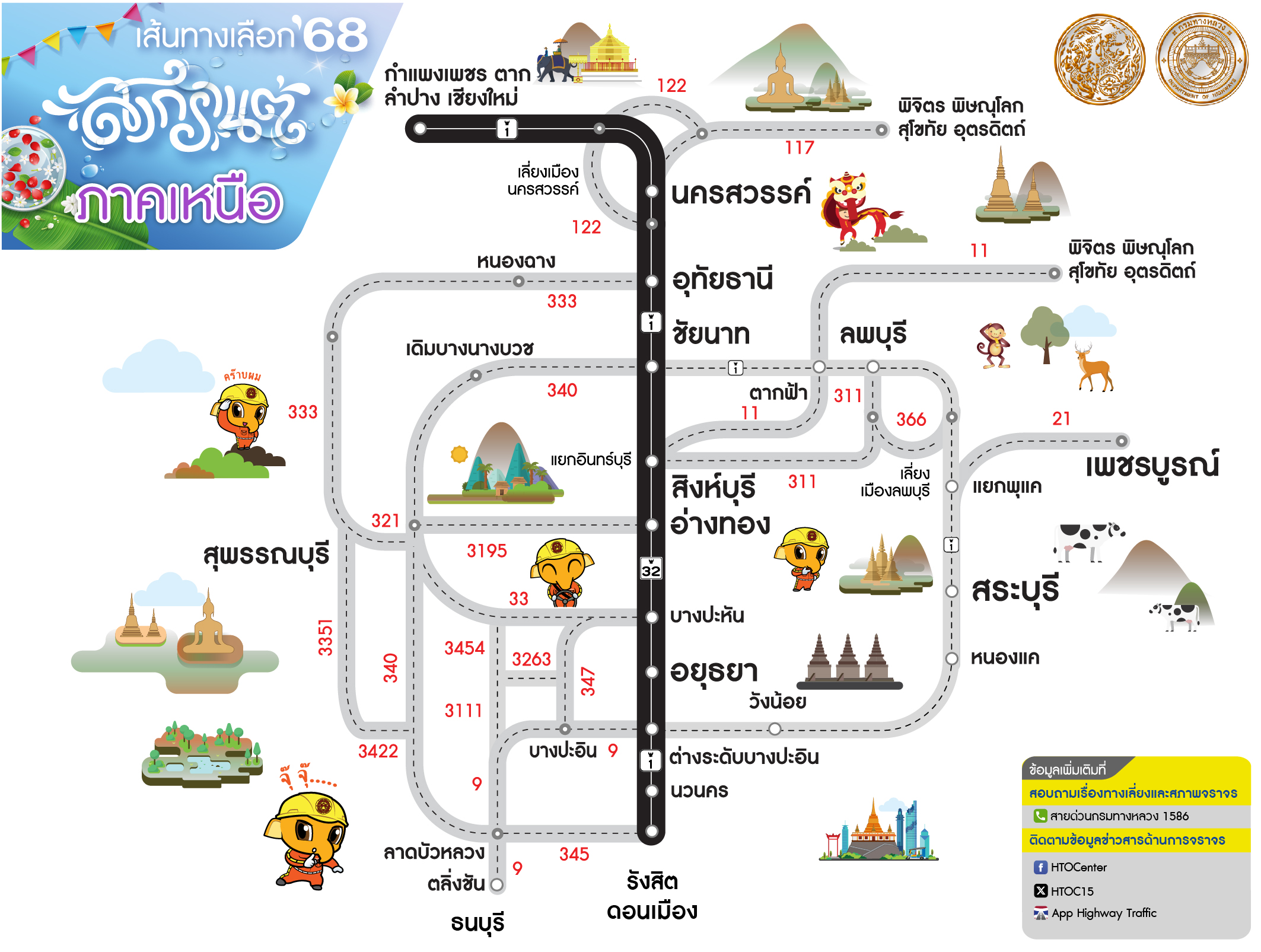 หากประชาชนต้องการสอบถามข้อมูลการเดินทางเพิ่มเติมหรือแจ้งเหตุด่วนเหตุร้ายระหว่างเดินทาง สามารถติดต่อได้ที่สายด่วนกรมทางหลวง 1586 (โทรฟรีทุกเครือข่ายตลอด 24 ชั่วโมง) สายด่วนมอเตอร์เวย์ 1586 กด 7 และตำรวจทางหลวง 1193