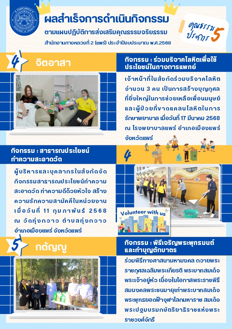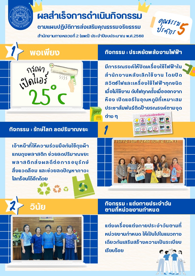 ผลสำเร็จการดำเนินกิจกรรม ตามแผนปฎิบัติการส่งเสริมคุณธรรมจริยธรรม สำนักงานทางหลวงที่ 2 (แพร่) ประจำปีงบประมาณ พ.ศ.2568