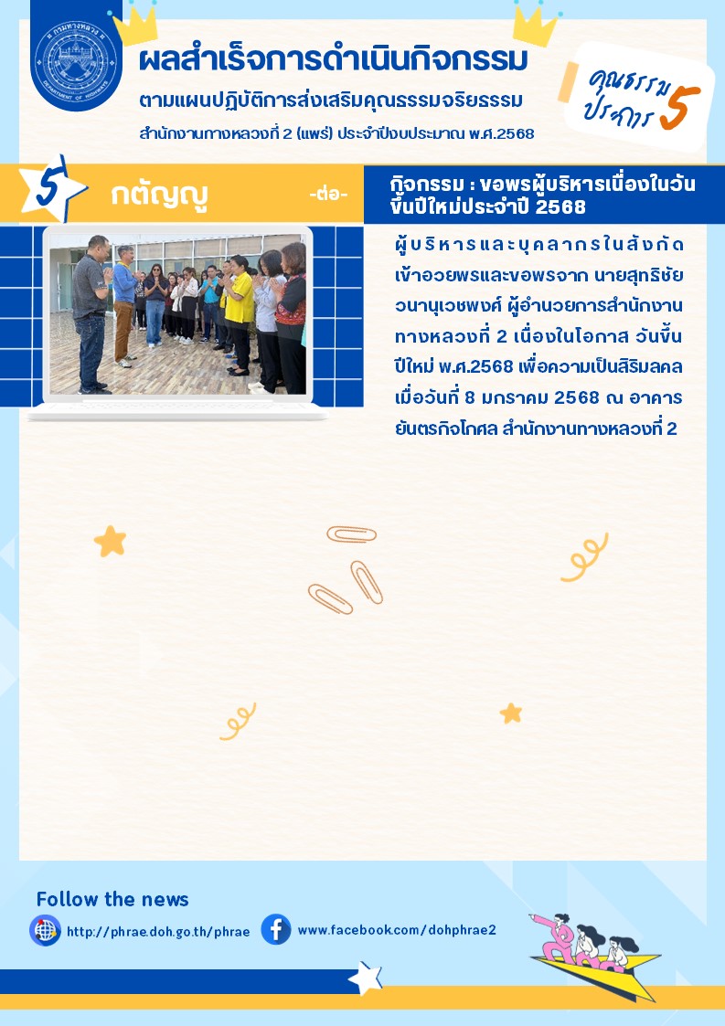 ข้อมูลข่าว : ผลสำเร็จการดำเนินกิจกรรม ตามแผนปฎิบัติการส่งเสริมคุณธรรมจริยธรรม สำนักงานทางหลวงที่ 2 (แพร่) ประจำปีงบประมาณ พ.ศ.2568