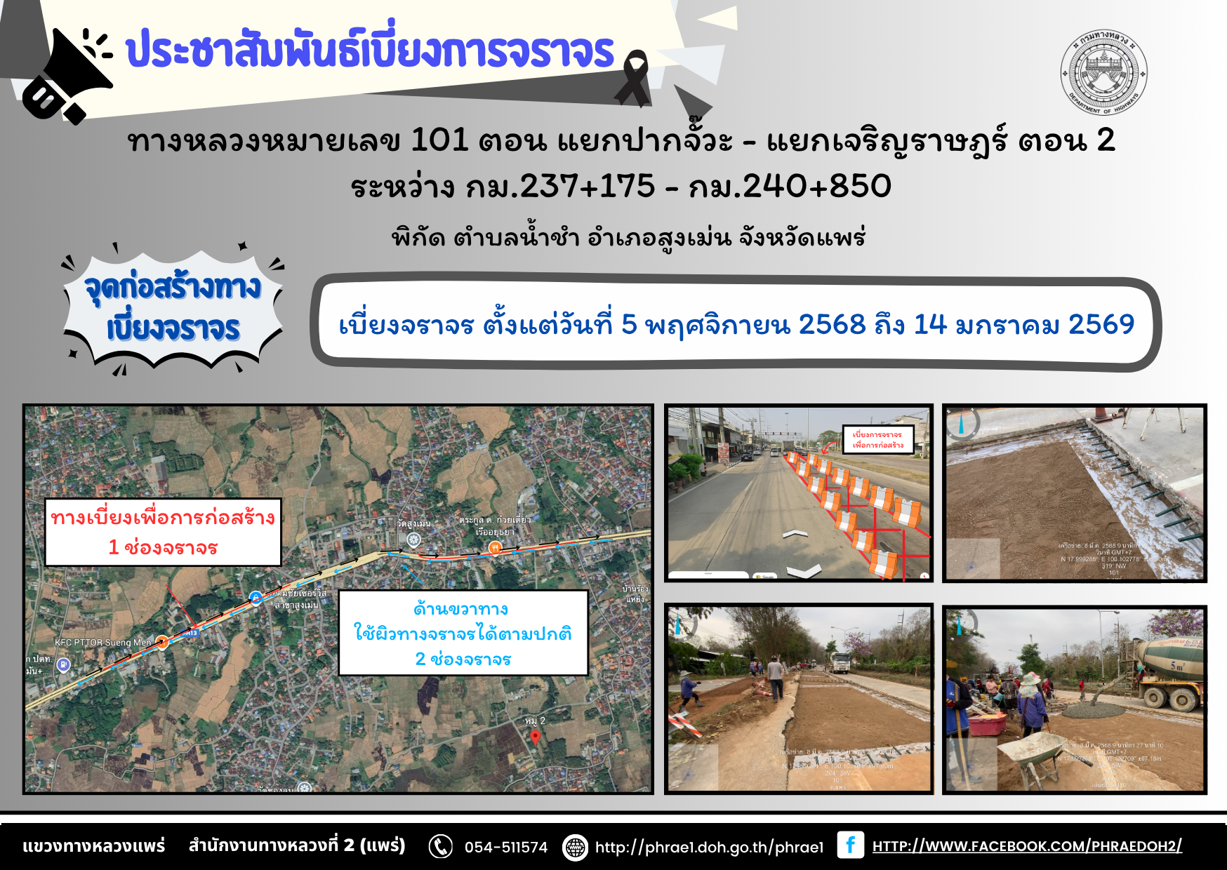 ประชาสัมพันธ์เบี่ยงการจราจร ทางหลวงหมายเลข 101 ตอน แยกปากจั๊วะ - แยกเจริญราษฎร์ ตอน 2 ระหว่าง กม.237+175 - กม.240+850
