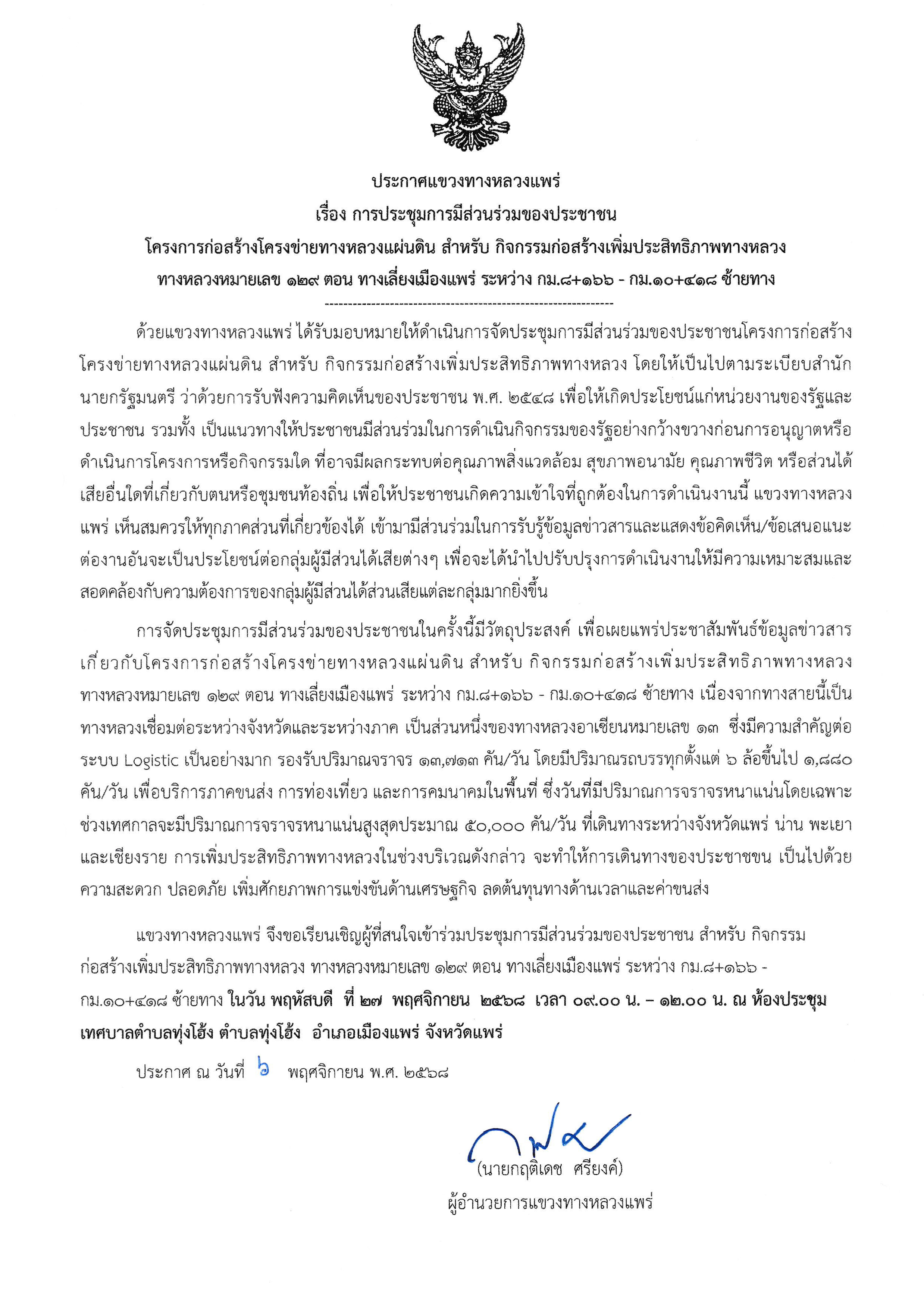 ประกาศแขวงทางหลวงแพร่ เรื่อง การมีส่วนร่วมของประชาชน โครงการก่อสร้างโครงข่ายทางหลวงแผ่นดิน สำหรับกิจกรรมก่อสร้างเพิ่มประสิทธิภาพทางหลวง ทางหลวงหมายเลข ๑๒๙ ตอน ทางเลี่ยงเมืองแพร่ ระหว่าง กม.๘+๑๖๖ - กม.๑๐+๔๑๘ ซ้ายทาง