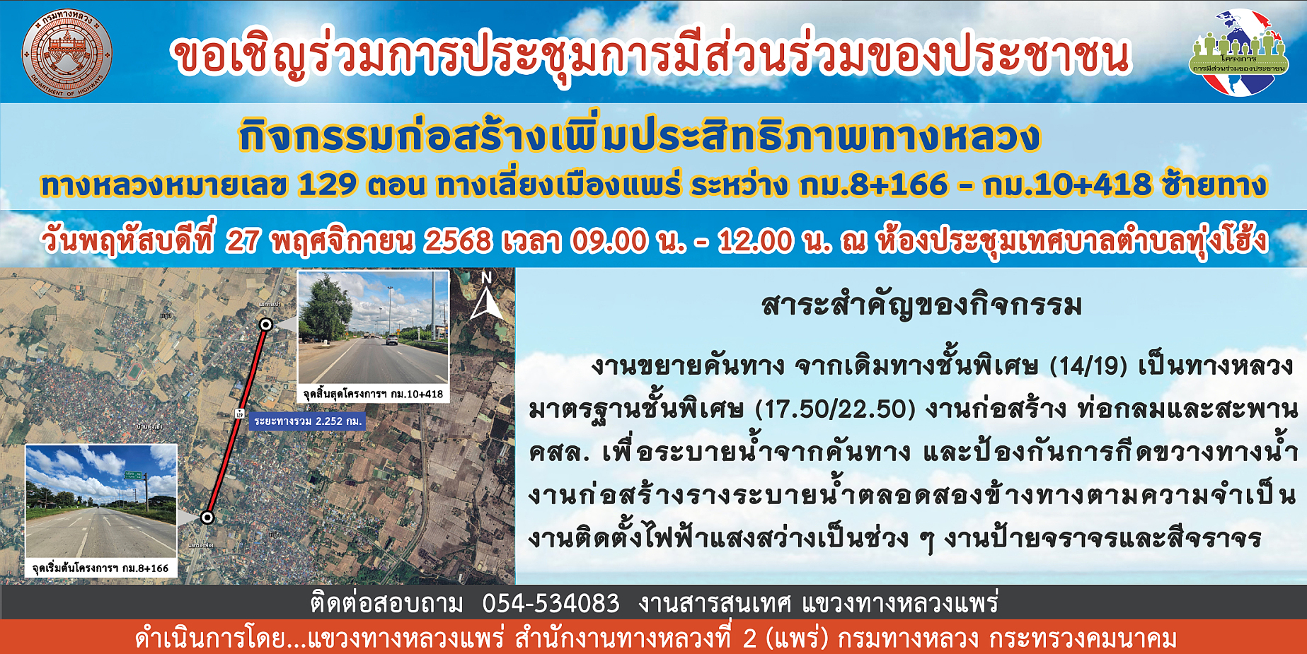 ประชาสัมพันธ์ การมีส่วนร่วมของประชาชน โครงการก่อสร้างโครงข่ายทางหลวงแผ่นดิน สำหรับ กิจกรรมก่อสร้างเพิ่มประสิทธิภาพทางหลวง ทางหลวงหมายเลข ๑๒๙ ตอน ทางเลี่ยงเมืองแพร่ ระหว่าง กม.๘+๑๖๖ - กม.๑๐+๔๑๘ ซ้ายทาง