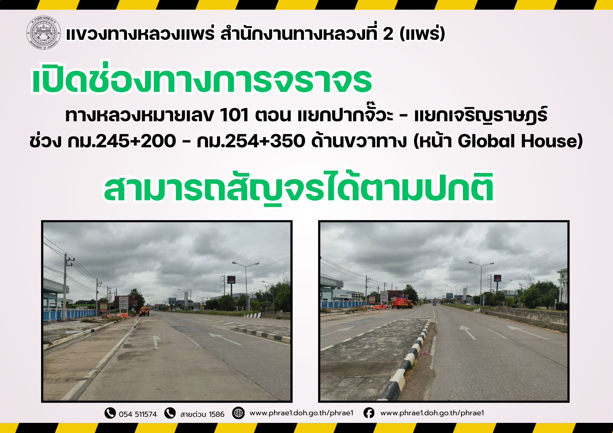 #เปิดช่องทางการจราจร ทางหลวงหมายเลข 101 ตอน แยกปากจั๊วะ - แยกเจริญราษฎร์ ช่วง กม.245+200 - กม.254+350 ด้านขวาทาง (หน้า Global House) "สามารถสัญจรได้ตามปกติ"
