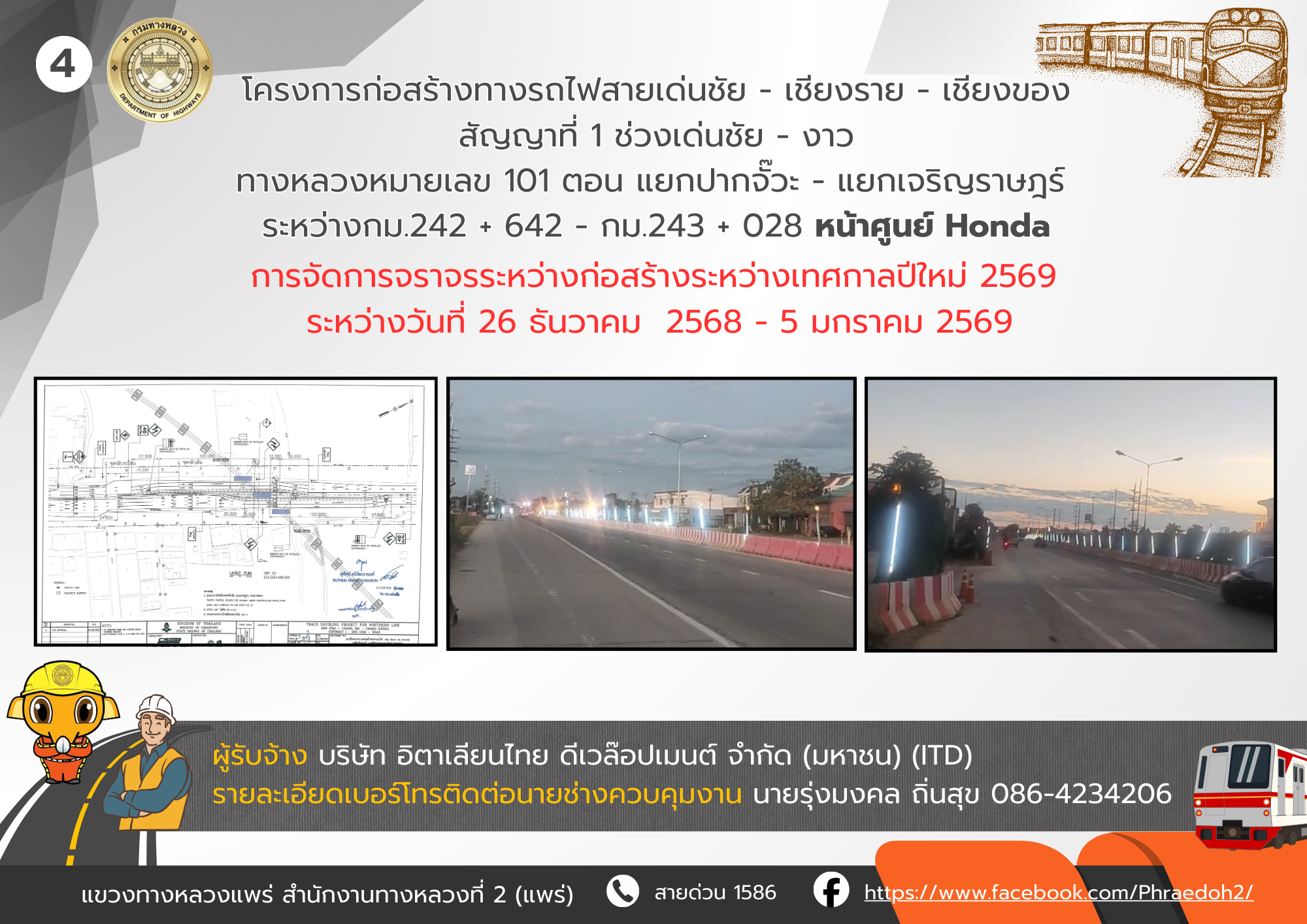แจ้งปิดการจราจร ช่วง กม.273 + 440 ถึง กม.272 + 520 เพื่อดำเนินการก่อสร้างปรับปรุงป้าย VMS ของสถานีตรวจสอบน้ำหนักร้องกวาง (ขาเข้า) จ.แพร่ วันที่ 6 มกราคม 2569 ตั้งแต่เวลา 19.00 น. ถึง 22.00 น.