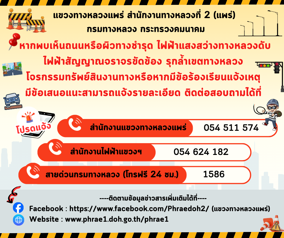 หากพบเห็นถนนหรือผิวทางชำรุด ไฟฟ้าแสงสว่างทางหลวงดับ ไฟฟ้าสัญญาณจราจรขัดข้อง รุกล้ำเขตทางหลวง โจรกรรมทรัพย์สินงานทางหรือหากมีข้อร้องเรียนแจ้งเหตุ มีข้อเสนอแนะสามารถแจ้งรายละเอียด ติดต่อสอบถามได้ที่