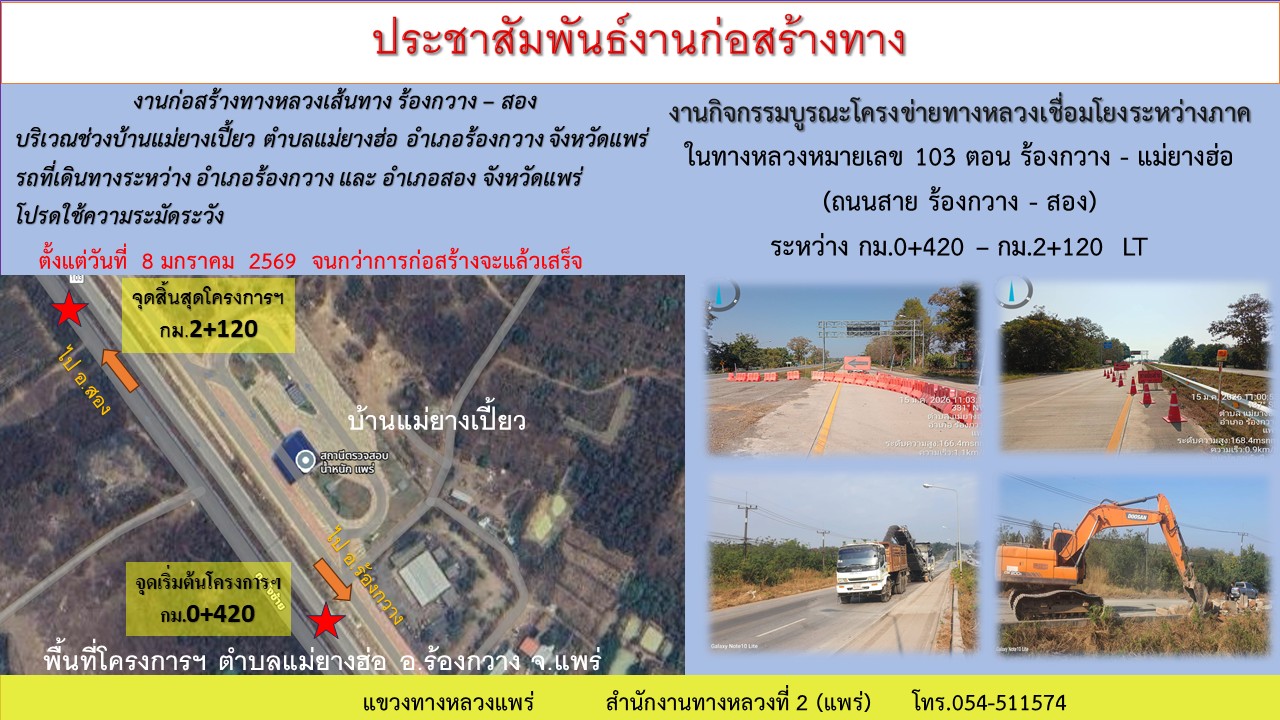 ประชาสัมพันธ์แขวงทางหลวงแพร่ งานก่อสร้างทางหลวงหมายเลข 103 ตอน ร้องกวาง - แม่ยางฮ่อ (ถนนสาน ร้องกวาง - สอง) ระหว่างกม.0+420 - กม.2+120 บริเวณช่วงบ้านแม่ยางเปี้ยว ตำบลแม่ยางฮ่อ อำเภอร้องกวาง จังหวัดแพร่ ตั้งแต่วันที่ 8 มกราคม 2569 หรือจนกว่าจะแล้วเสร็จ