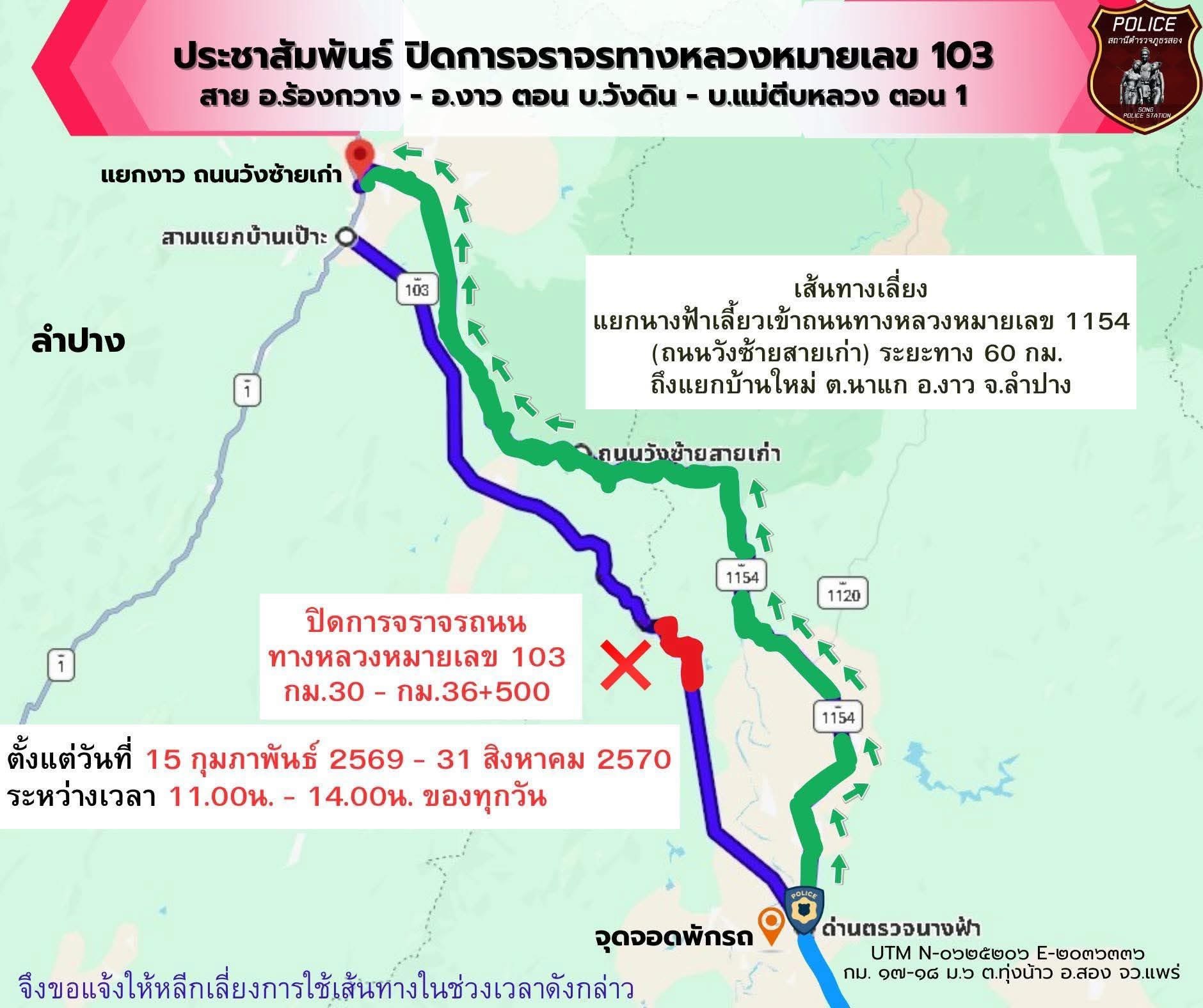 แจ้งเบี่ยงการจราจร ทางหลวงหมายเลข 103 สาย อ.ร้องกวาง - อ.งาว ตอน บ.วังดิน - บ.แม่ตีบหลวง ตอน 1 ระหว่าง กม.30+000.000 - กม.36+500.000 ระยะทางยาวประมาณ 6.500 กิโลเมตร