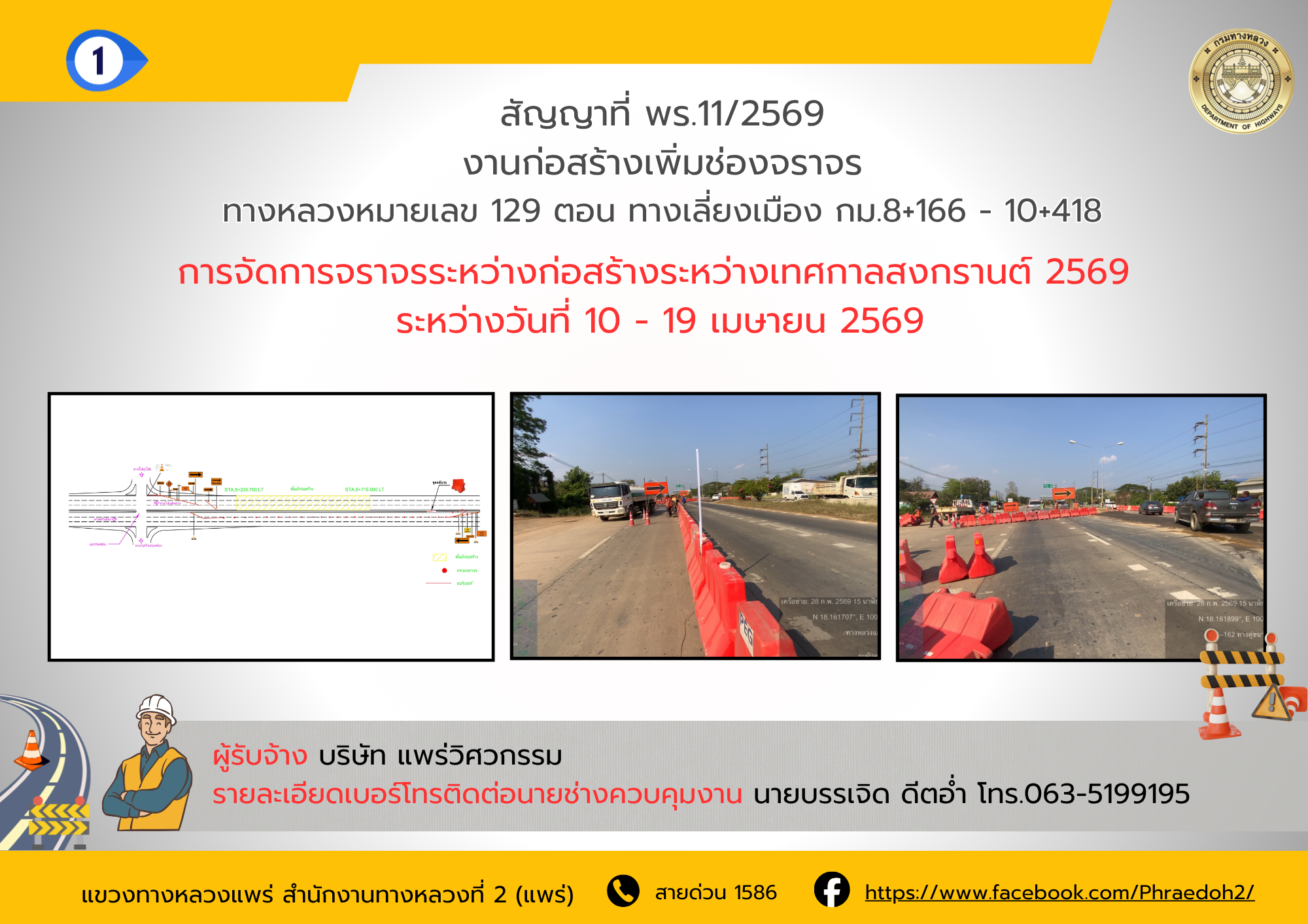 ประชาสัมพันธ์แขวงทางหลวงแพร่ การจัดการจราจรระหว่างก่อสร้างระหว่างเทศกาลสงกรานต์ 2569 ระหว่างวันที่ 10 - 19 เมษายน 2569