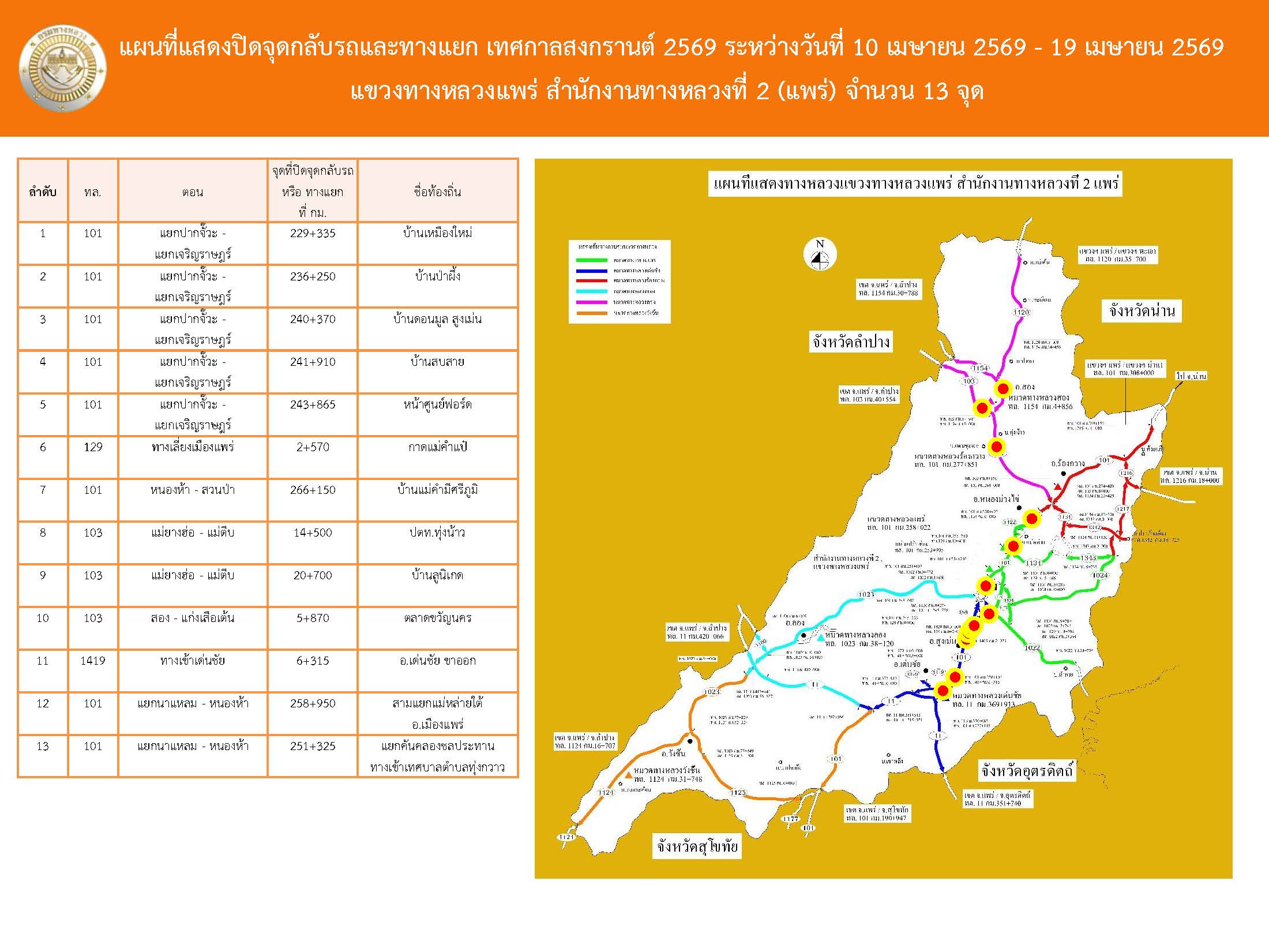 ประชาสัมพันธ์แขวงทางหลวงแพร่ แผนที่แสดงปิดจุดกลับรถและทางแยก เทศกาลสงกรานต์ 2569 ระหว่างวันที่ 10 - 19 เมษายน 2569