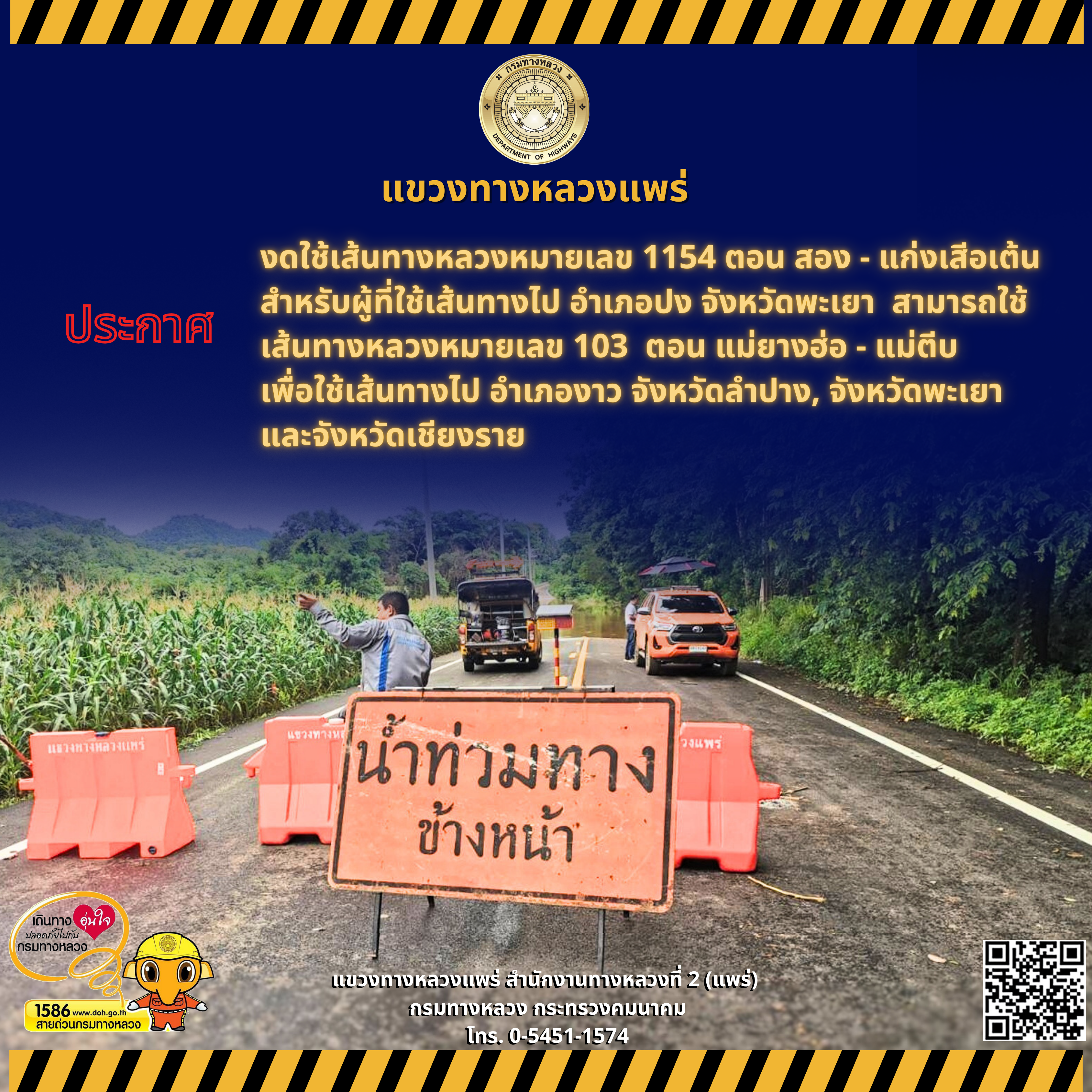 แจ้งข่าวประชาสัมพันธ์ งดใช้เส้นทางหลวงหมายเลข 1154 ตอน สอง - แก่งเสีอเต้น สำหรับผู้ที่ใช้เส้นทางไป อำเภอปง จังหวัดพะเยา