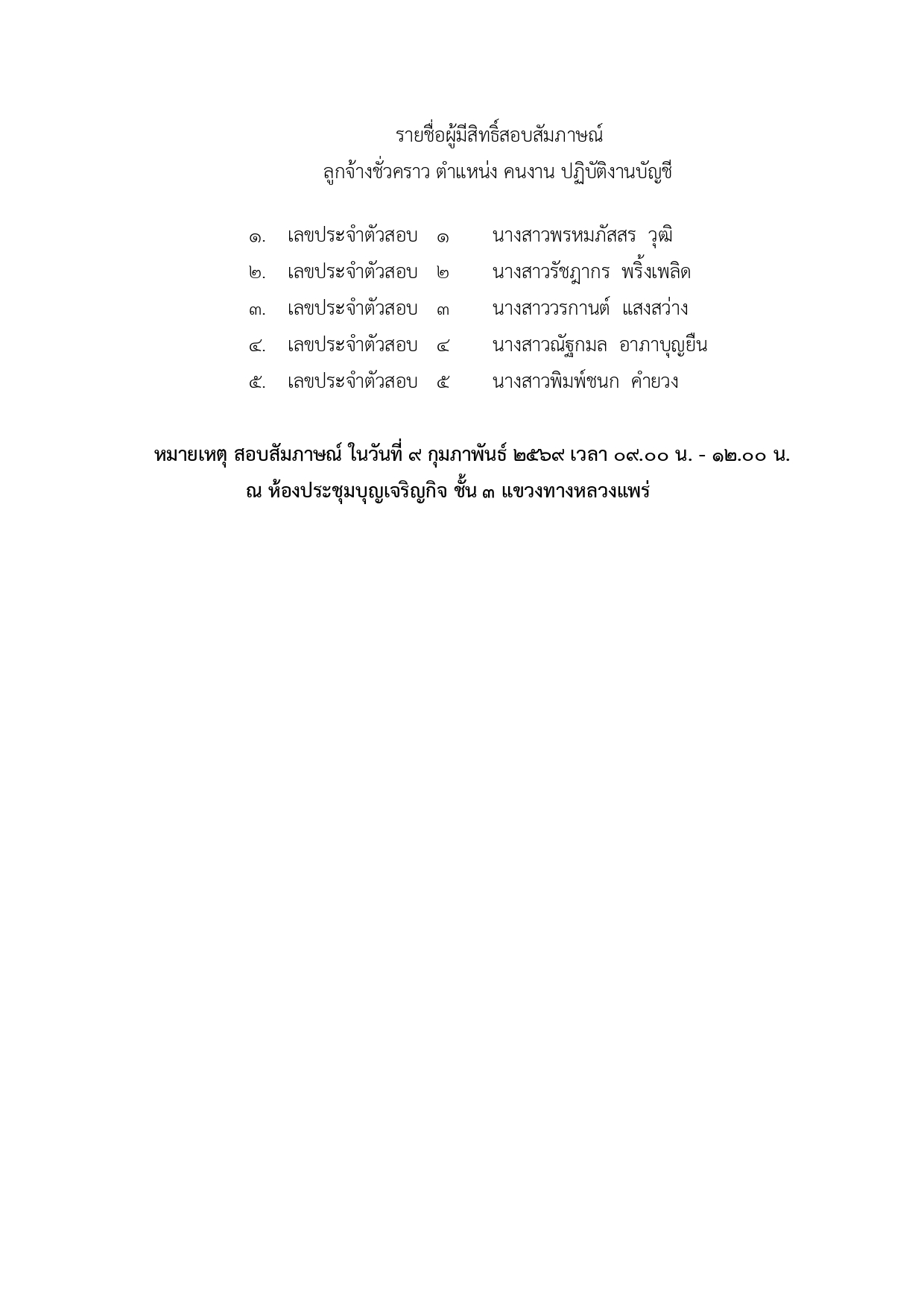 ประกาศผู้มีสิทธิ์เข้ารับการคัดเลือกประเมินสมรรถนะด้วยวิธีการสอบสัมภาษณ์ ตำแหน่ง คนงาน ปฏิบัติงานบัญชี ในวันที่ 9 กุมภาพันธ์ 2569 เวลา 09.00 - 12.00 น. ณ ห้องประชุมบุญเจริญกิจ ชั้น 3 แขวงทางหลวงแพร่
