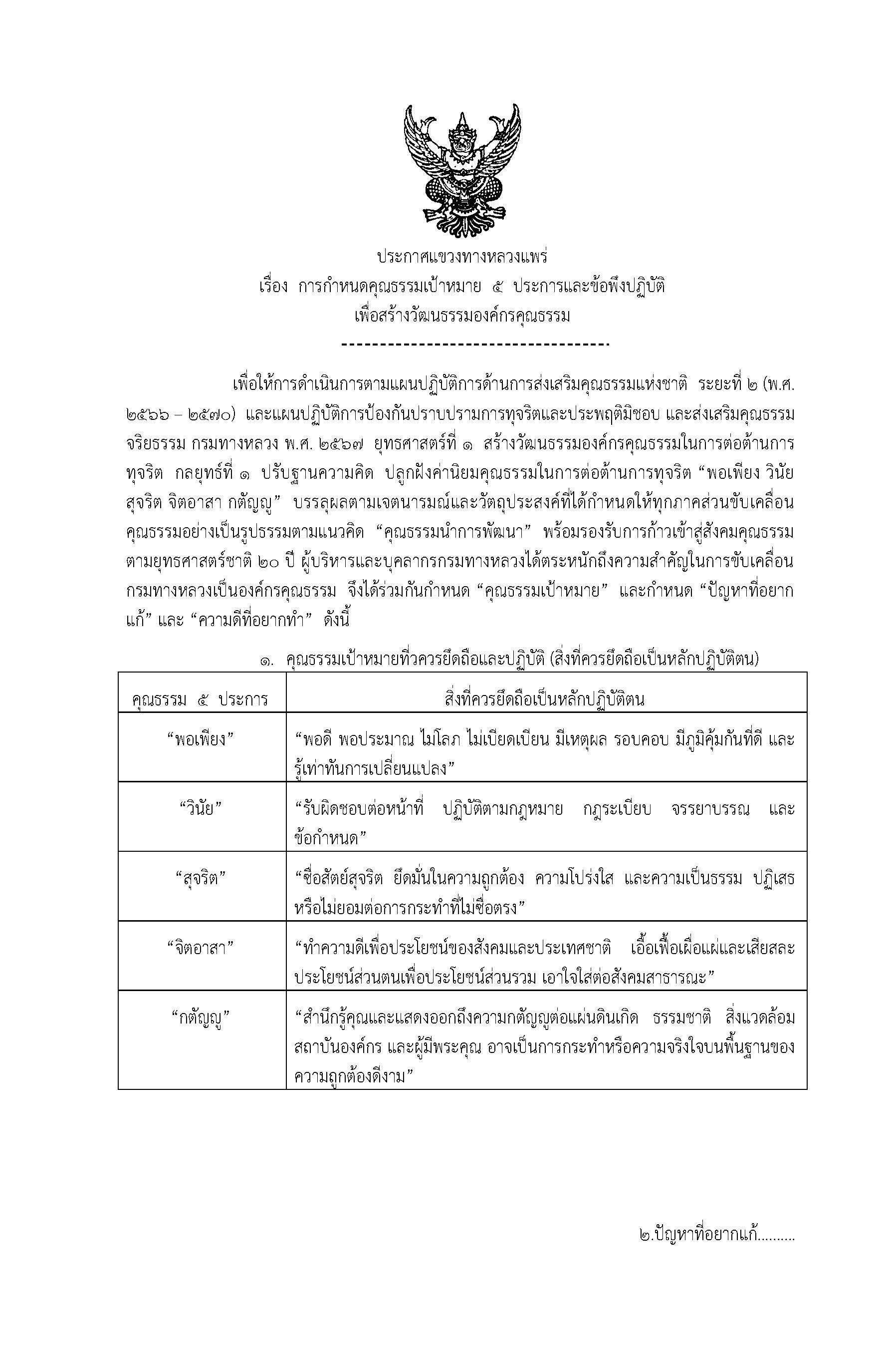 เพื่อให้การดำเนินการตามแผนปฏิบัติการด้านการส่งเสริมคุณธรรมแห่งชาติ ระยะที่ 2 (พ.ศ. 2566 – 2570) และแผนปฏิบัติการป้องกันปราบปรามการทุจริตและประพฤติมิชอบ และส่งเสริมคุณธรรม จริยธรรม กรมทางหลวง พ.ศ. 2567 ยุทธศาสตร์ที่ 1 สร้างวัฒนธรรมองค์กรคุณธรรมในการต่อต้านการทุจริต กลยุทธ์ที่ 1 ปรับฐานความคิด ปลูกฝังค่านิยมคุณธรรมในการต่อต้านการทุจริต “พอเพียง วินัย สุจริต จิตอาสา กตัญญู” บรรลุผลตามเจตนารมณ์และวัตถุประสงค์ที่ได้กำหนดให้ทุกภาคส่วนขับเคลื่อนคุณธรรมอย่างเป็นรูปธรรมตามแนวคิด “คุณธรรมนำการพัฒนา” พร้อมรองรับการก้าวเข้าสู่สังคมคุณธรรมตามยุทธศาสตร์ชาติ 20 ปี ผู้บริหารและบุคลากรกรมทางหลวงได้ตระหนักถึงความสำคัญในการขับเคลื่อนกรมทางหลวงเป็นองค์กรคุณธรรม จึงได้ร่วมกันกำหนด “คุณธรรมเป้าหมาย” และกำหนด “ปัญหาที่อยากแก้” และ “ความดีที่อยากทำ”