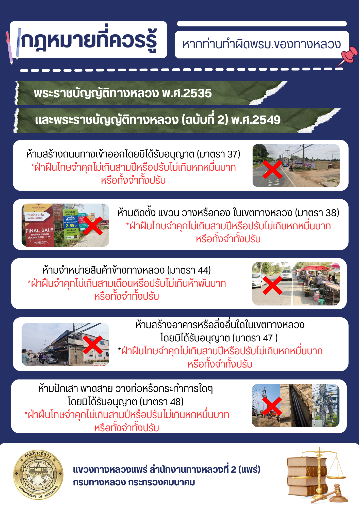 พระราชบัญญัติทางหลวงพ.ศ.2535 และพระราชบัญญัติทางหลวง(ฉบับที่ 2) พ.ศ.2549 และการดำเนินการโครงการ "ทางหลวงปลอดภัยขับขี่สบายตา คืนเขตทาง ทางเท้า การรุกล้ำ เสริมสง่าราศี ภูมิทัศน์ข้างทาง เพื่อความสะดวกและปลอดภัย การพัฒนาที่ยั่งยืน" ในเขตทางหลวง จังหวัดแพร่