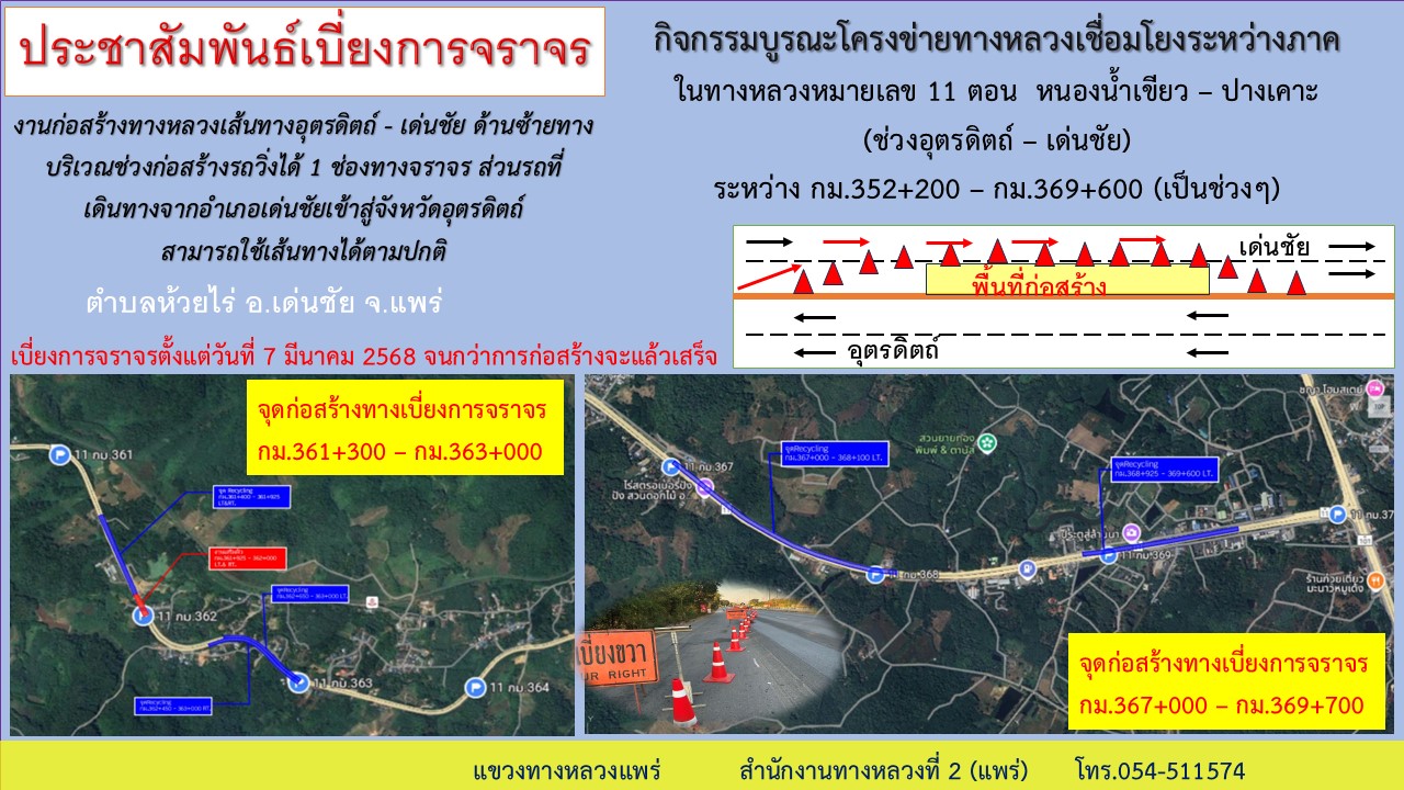 ประชาสัมพันธ์เบี่ยงการจราจร งานก่อสร้างกิจกรรมบูรณะโครงข่ายทางหลวงเชื่อมโยงระหว่างภาค ในทางหลวงหมายเลข 11 ตอน หนองน้ำเขียว - ปางเคาะ (ช่วงอุตรดิตถ์ - เด่นชัย) ระหว่างกม.352+200 - กม.369+600 (เป็นช่วงๆ) ด้านซ้ายทาง บริเวณช่วงก่อสร้างรถวิ่งได้ 1 ช่องทางจราจร ส่วนรถที่เดินทางจากอำเภอเด่นชัยเข้าสู่จังหวัดอุตรดิตถ์ สามารถใช้เส้นทางได้ตามปกติเบี่ยงการจราจรตั้งแต่วันที่ 7 มีนาคม 2568 จนกว่าการก่อสร้างจะแล้วเสร็จ ขออภัยในความไม่สะดวก