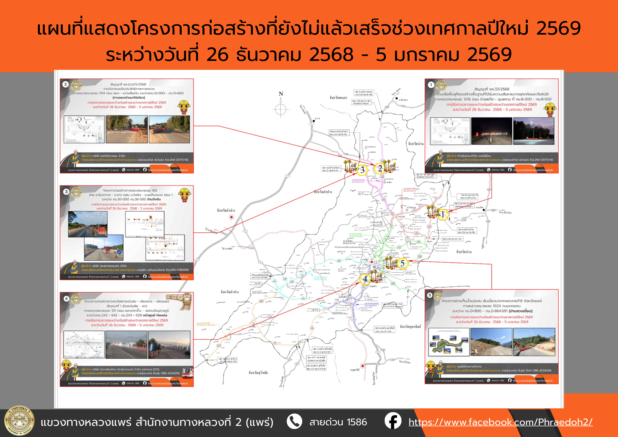แผนที่แสดงโครงการก่อสร้างที่ยังไม่แล้วเสร็จช่วงเทศกาลปีใหม่ 2569 ระหว่างวันที่ 26 ธันวาคม 2568 - 5 มกราคม 2569