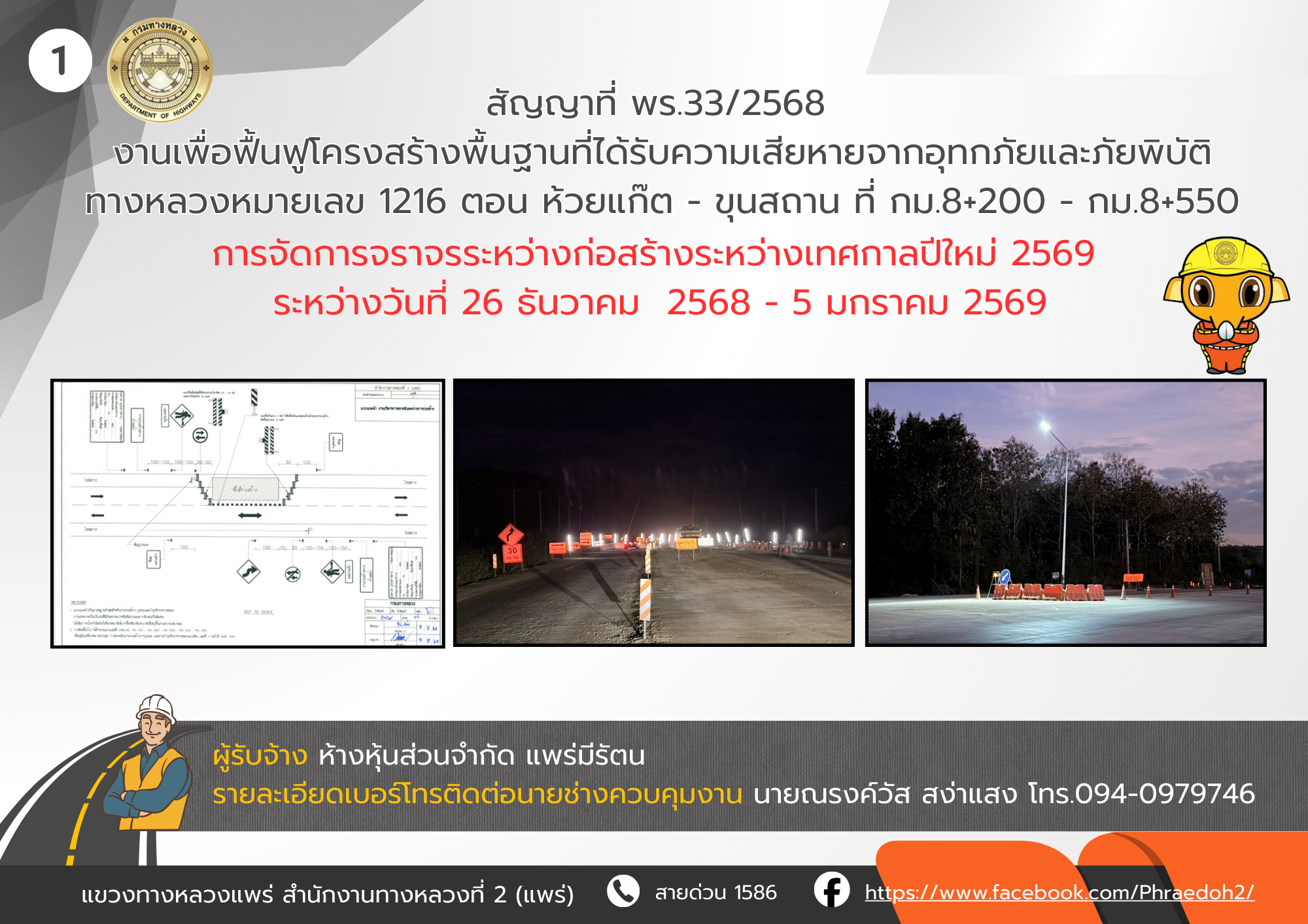 สัญญาที่ พร.33/2568 งานเพื่อฟื้นฟูโครงสร้างพื้นฐานที่ได้รับความเสียหายจากอุทกภัยและภัยพิบัติ ทางหลวงหมายเลข 1216 ตอน ห้วยแก๊ต - ขุนสถาน ที่ กม.8+200 - กม.8+550